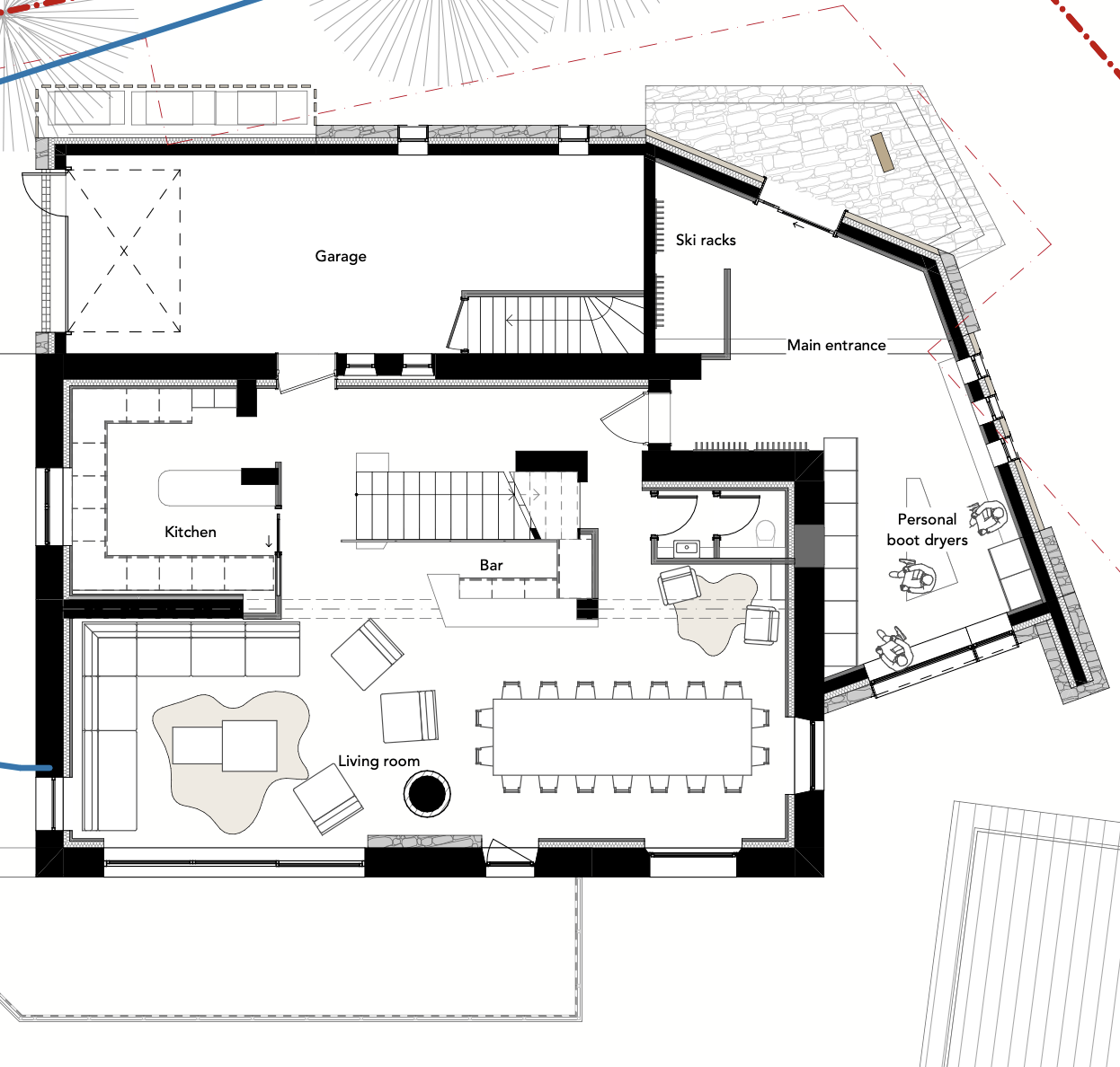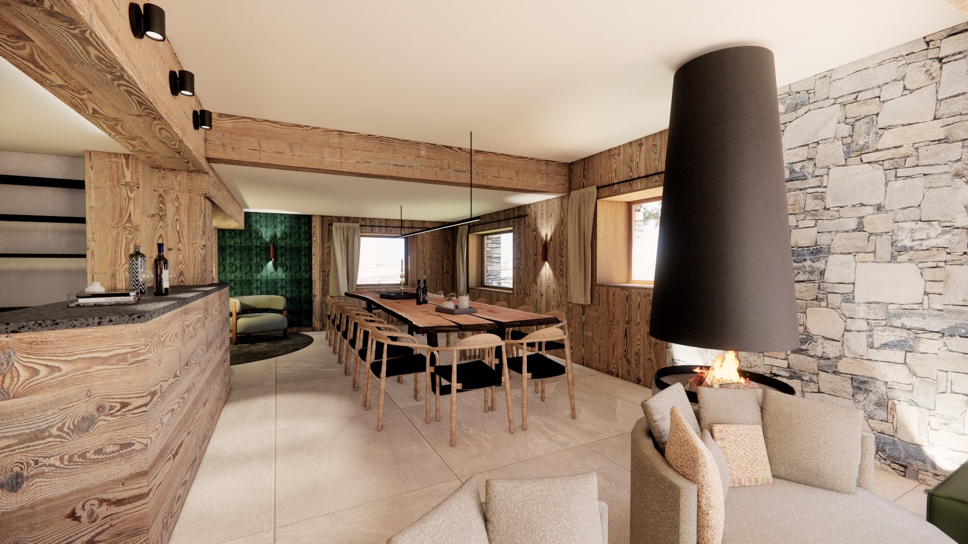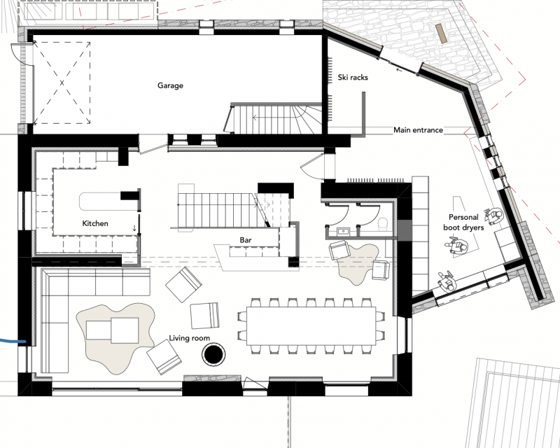 The generous living and dining space with cosy fire will allow the perfect setting to sit back and enjoy the delicious meals created by your chalet’s team.