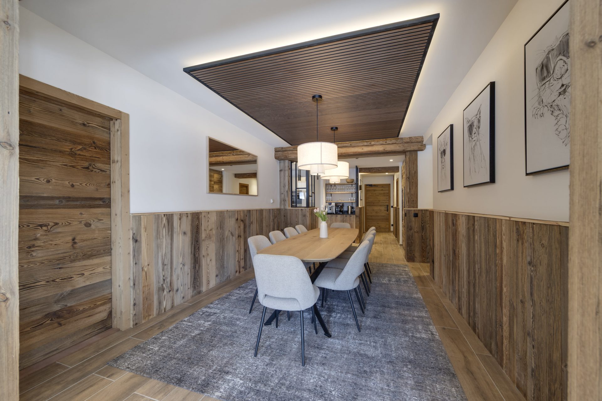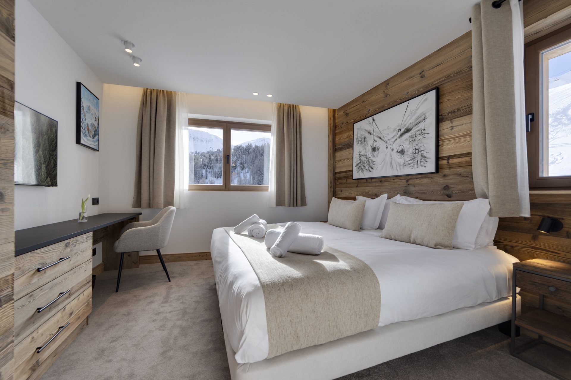 Each suite has been meticulously designed, with high quality interiors and mod cons, eco friendly fire place, comfy furnishings and all set to get the very best from the properties exceptional location. Large windows are well positioned to show off the fabulous views across to Mont Blanc. The Makalu suite offers a particularly good family room with full sized bunks and a single bed.